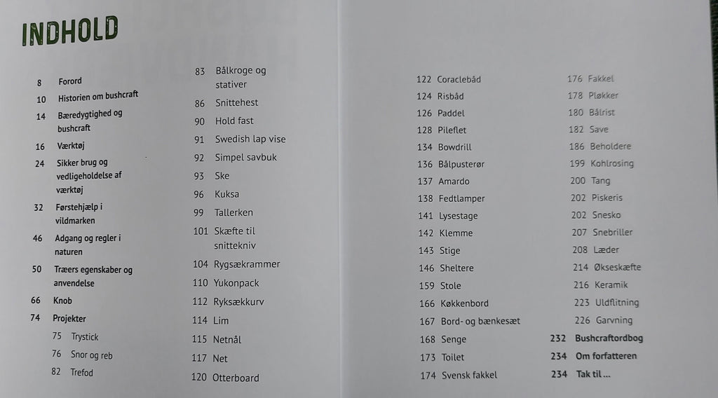 Bogen indeholder ligeledes værktøjskendskab og vedligeholdelse, regler om adgang til naturen, træ identifikation, førstehjælp og meget mere.