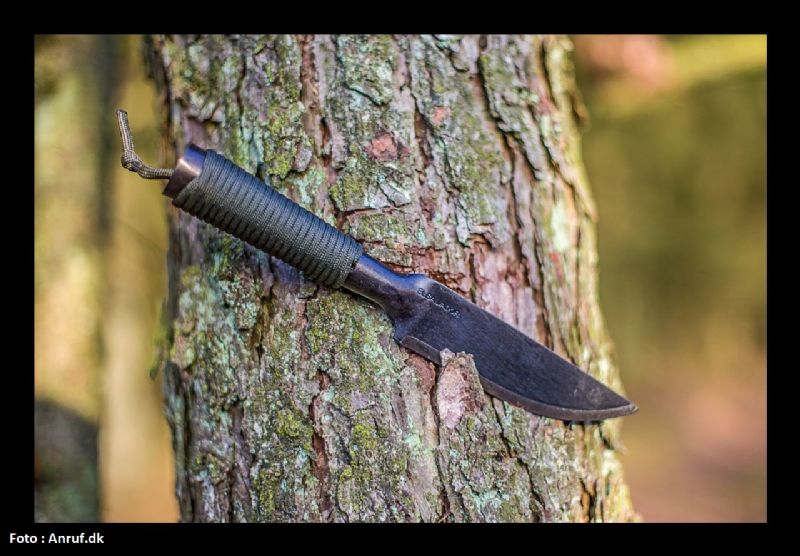 Lidt anderledes kniv helt i 1075 kulstofstål med hult stål håndtag med paracord. Kommer med svingbar kraftig læder skede.