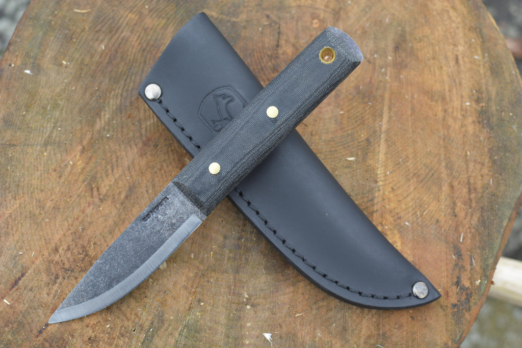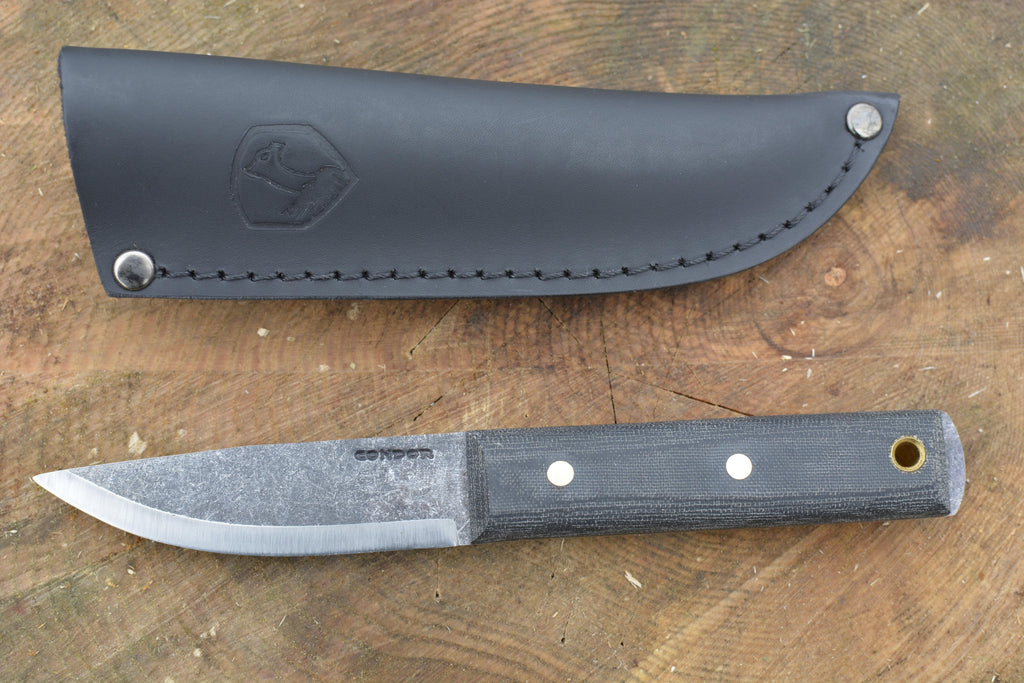 Condor Woodlaw med en fulltang 1075 kulstof stål klinge med scandi grind en fuldblods bushcraftkniv til dem som skal bruge en arbejdshest af kniv, men knivens profil gør den også velegnet til de lidt finere snitte opgaver.