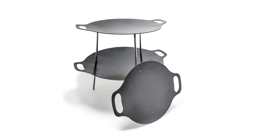 Stålpanderne fungerer også som bålfad, hvis du ønsker at hæve bålet eller er et sted hvor det ikke er hensigtmæssigt at have bål på jorden.